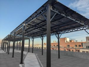 Brooklyn Solar Canopy Co. offers two unique solar canopy product designs – Post-Truss and A-Frame – both of which are suitable for commercial use. Our A-Frame canopies are optimal for use on flat rooftops and elevate over common rooftop obstructions and code barriers to meet a diverse range of commercial requirements.